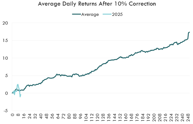 Source: Bloomberg, Innovator. Data from 12/31/1949 - 3/31/2025. Average S&P 500 Index performance following an initial 10% drawdown 12 months out. 2025 performance from 3/13/2025 - 3/31/2025. Past performance is not necessarily indicative of future results. One cannot invest directly into an index. Index performance does not account for fees and expenses.