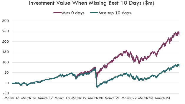 We’ve already supported the view that remaining invested is key. In the interest of remaining balanced, we’d like to discuss our view that the classic argument about missing the “10 best days” is misleading. You’ve heard it before: missing just the 10 best days in the market crushes your returns. While this stands true, it's highly unlikely to be that unlucky—to miss only those 10 days while being invested the rest of the time. Regardless, my view is that staying invested amidst the volatility still is important.