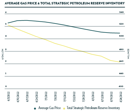 | Source: U.S. Energy Information Administration, U.S. Ending Stocks of Crude Oil in SPR, 10/1/1977 – 6/30/2022 | Source: Bloomberg LP, DOE Strategic Petroleum Reserve (SPR) Total Inventory Data, US Average Gasoline Price, 6/3/2022 – 8/26/2022 |