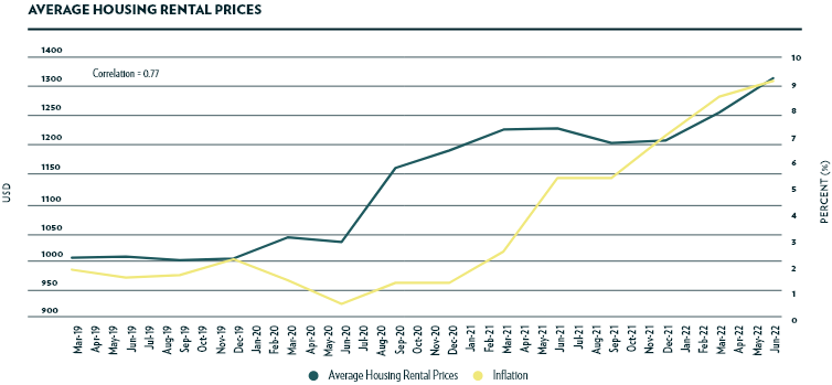 Source: Bloomberg LP, Median Asking Rent In The United States, US CPI Urban Consumers YoY NSA, 3/31/2019 – 6/30/2022