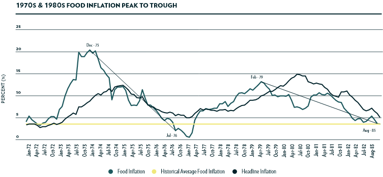 During the 1970s and 1980s, the last time inflation was this high, the price of food was consistently one of the leading drivers of inflation moving higher and moving lower. In the late 1970s, nearing the end of the high inflation environment, food inflation peaked at 13.1%. From that point on, it took an additional 44 months, or over 3.5 years, to retreat back to the historical average of 3.5%.