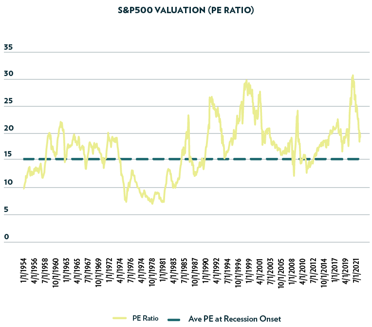 Higher interest rates have driven equity valuations lower in 2022. The PE on the S&P 500 Index has moved from 24X to start the year, to 19X today, dragging the market lower. Even with the large decline, however, valuations remain elevated at around 25% above the historical average valuation at recession onset (see chart below). Should the narrow path to a soft-landing fade, and markets fully discount the prospect of a recession, valuations will likely have further to fall.
