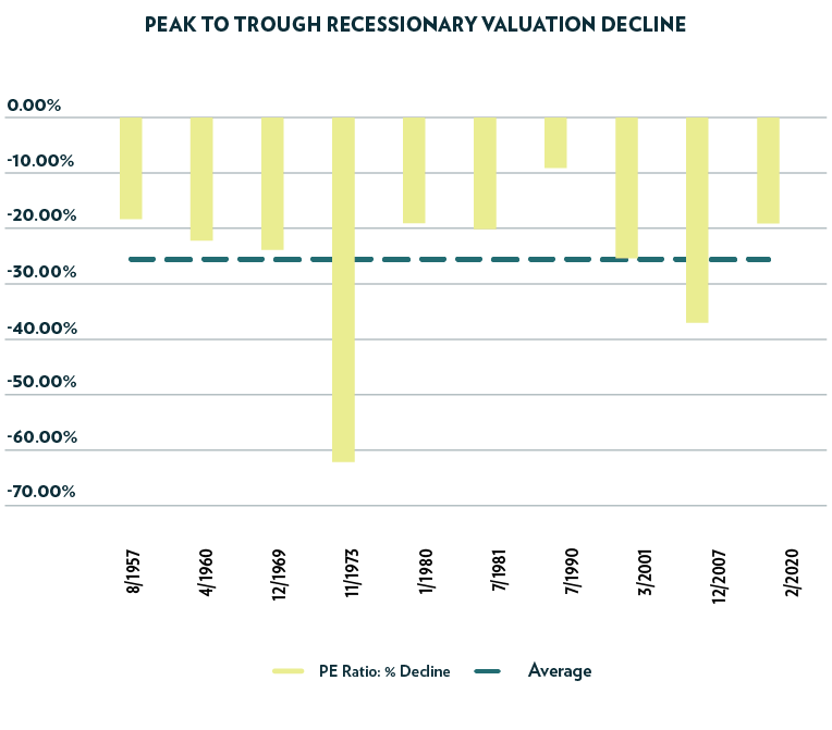 Looking at the last 10 recessions, equity valuations fell 26%, peak to trough, bottoming out at just under 13X earnings, on average. The most extreme drop took place in the recession of 1973 when inflation and the Federal Funds rate were sky rocking. The PE on the S&P 500 dropped 62%, moving from 19X earnings in early 1973 to 7X earnings in early 1975.