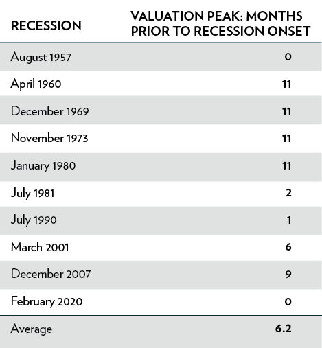 Valuations Peaked on Average 6-Months Prior to Recession Onset