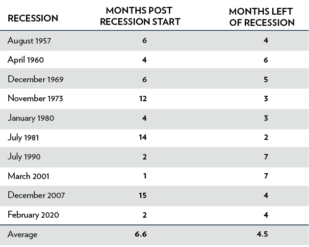 As shown in the table below, on average, valuations bottom 7 months post-recession onset, and begin to rise again around 5 months before the recession ends. Interestingly, in 70% of the in the instances, the valuation bottom occurred prior to the bottom in economic activity (measured by PMIs).