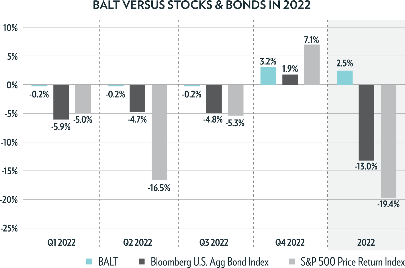 Source: Bloomberg LP, data from 12/31/2021 - 12/31/2022. Stocks represented by the S&P 500 Price Return Index, bonds represented by the Bloomberg U.S. Agg Bond Index. Performance quoted represents past performance, which is no guarantee of future results. Investment returns and principal value will fluctuate, so you may have a gain or loss when shares are sold. Current performance may be higher or lower than that quoted. Visit innovatoretfs.com/balt for standardized and current month-end performance. One cannot invest directly in an index.