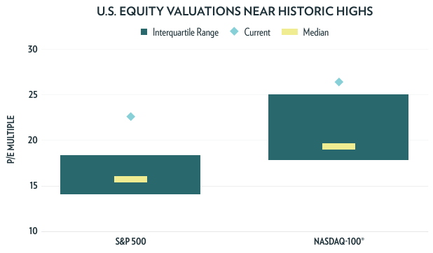 Source: Bloomberg, Innovator. S&P 500 Index consensus forward 12-month blended PE multiples from 3/31/1990 - 11/26/2024. Nasdaq-100 Index data from 6/29/2001 – 11/26/2024. Interquartile range is the spread between the medians of the upper and lower half of data. Price-to-earnings ratio (“P/E”) is a ratio of a company’s share price to its earnings per share over a year.