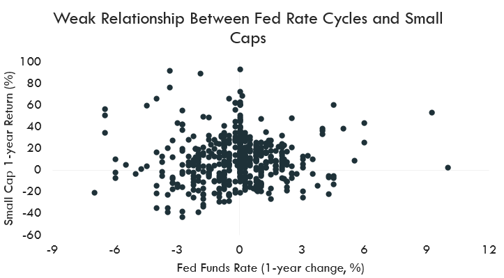 Source: Bloomberg, Innovator. Small Cap 1-Year Returns, represented by the Russell 2000 Index, shown relative to the starting US Federal Funds Rate. Past performance is not necessarily indicative of future results. One cannot invest directly in an index.