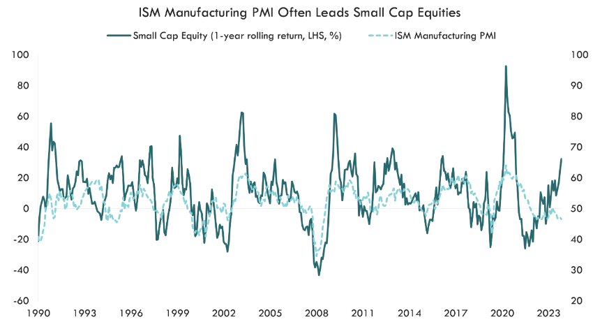 Source: Bloomberg, Innovator. Small-cap equity returns represented by the Russell 2000 Index. U.S. ISM Manufacturing Purchasing Managers Index (“PMI”) Level shown. Monthly data from 12/31/1990 - 10/31/2024. Past performance is not necessarily indicative of future results. One cannot invest directly in an index.