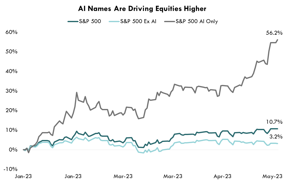 Right now, we are seeing a battle in the equity markets. The matchup? Artificial Intelligence vs. the Macro Backdrop. Equities have been rising on optimism over the impact AI may have on future growth and productivity, while debt ceiling woes, recession fears, and geopolitical risks have all been pushed to the side. But how significant might the impact of AI really be? According to Goldman, the technology has the potential to increase annual global GDP by 7% and boost profit margins by 4% over the next 10 years. Even a partial delivery on those estimates would be significant. But right now, how should we view the longer-term tailwind in light of a near-term backdrop that doesn’t look rosy? Who will Win? In this month’s newsletter, we examine this question and look at how investors can potentially position portfolios for success.