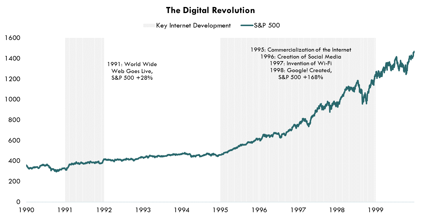 How might equities react if this is a similar story? Looking back to the Digital Revolution, as an example, the equity market enjoyed significant gains. Growth kicked up in the back half of the decade, profit margins widened, and from the start of 1990 through the end of the decade, the S&P 500 Index produced an annualized total return of 18%; significantly above the long run average.