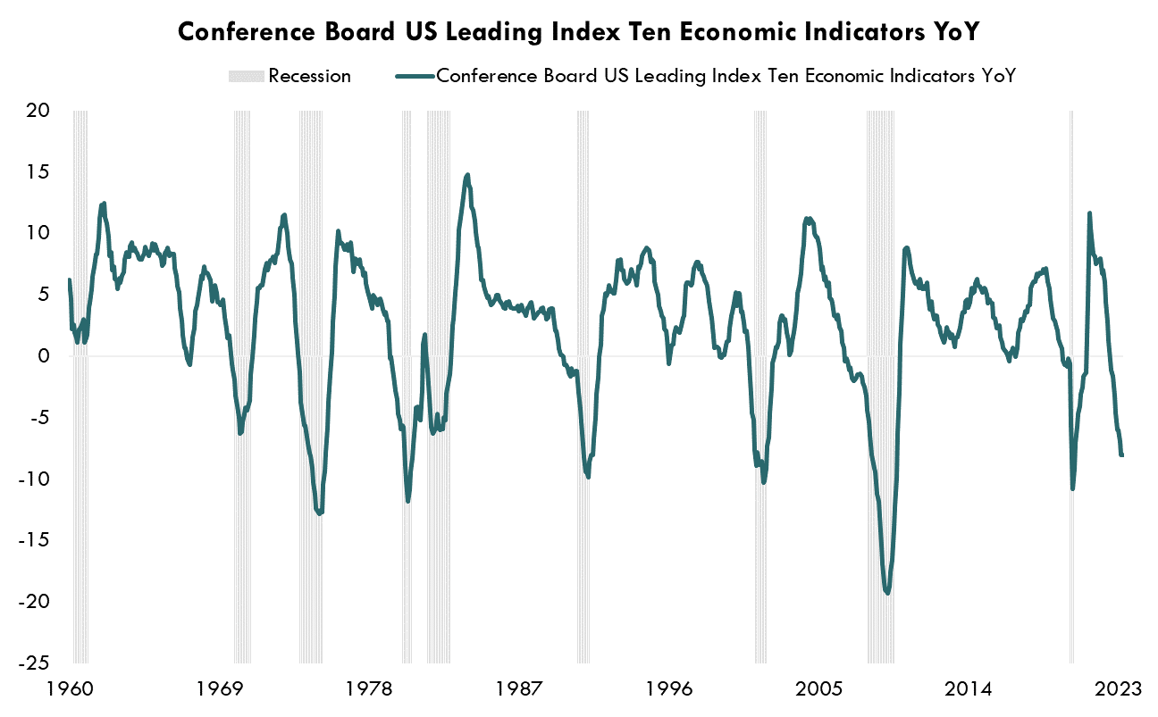 Source: Bloomberg LP, Conference Board US Leading Index Ten Economic Indicators YoY, 1960-2023