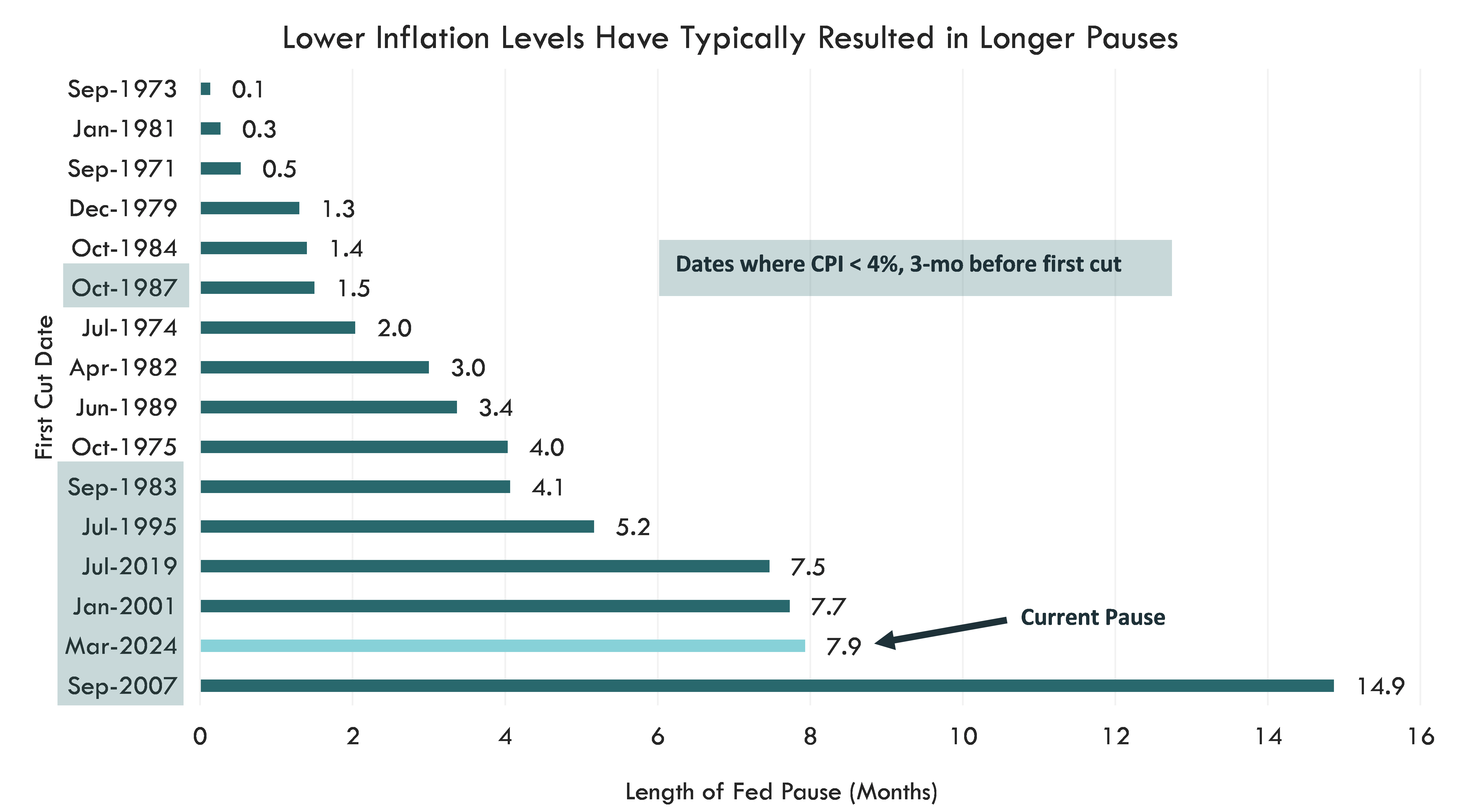 Based on the Fed’s history of pause lengths and the current labor market, we believe that the current pause has room to extend. Right or wrong, investors should understand how to position themselves as the Fed considers lowering rates.