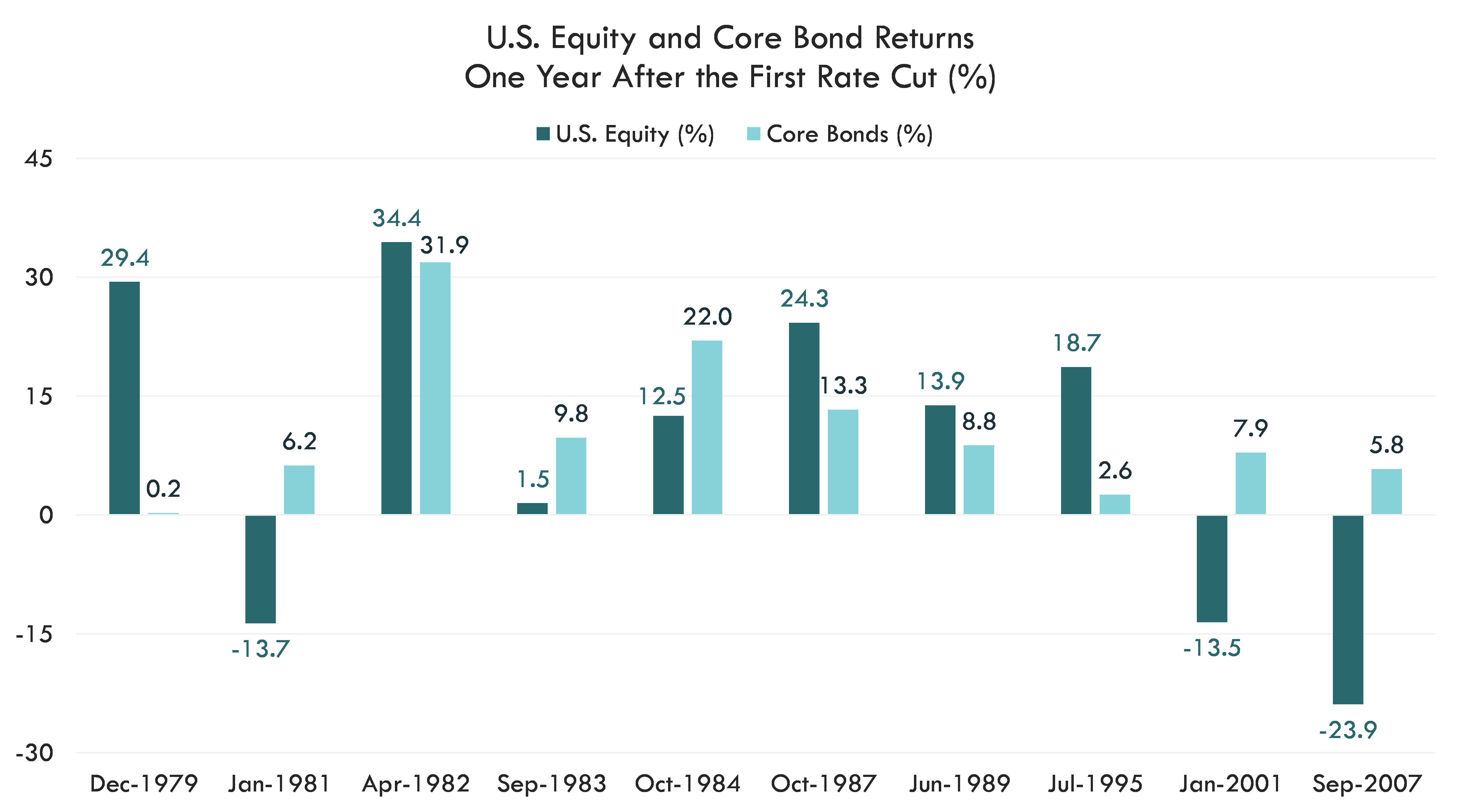 The real-time assessment of whether the Fed's rate adjustments are appropriate adds an additional layer of complexity, underscoring the critical role of proper asset allocation. An analysis of the three months leading up to the first rate cut reveals that U.S. equities were positive less than half the time, with returns ranging from a dismal -27% to a modest 10%. In contrast, bonds performed more resiliently, boasting positive rates exceeding 70% and returns ranging from -4.3% to a commendable 8.8%. Notably, in the lead-up to rate cuts, bonds have outperformed stocks slightly more than half the time, emphasizing the considerations that investors must navigate during rapidly changing market environments.