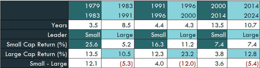 Since 1979, small-cap and large-cap equities have passed the performance baton back and forth over extended periods. In the past 10 years, large caps have outperformed by an annualized 5.4%, leading some to question the persistence of the size premium proposed in the early 1990s by Eugene Fama and Kenneth French. Some argue that the evolving private equity market may explain the erosion in small-cap performance relative to larger companies. Recently, restrictive Federal Reserve rates have particularly weighed on small-cap companies with more debt-sensitive balance sheets. With the Fed now easing rates, many believe small-caps may be poised to break the decade-long streak of large-cap dominance.
