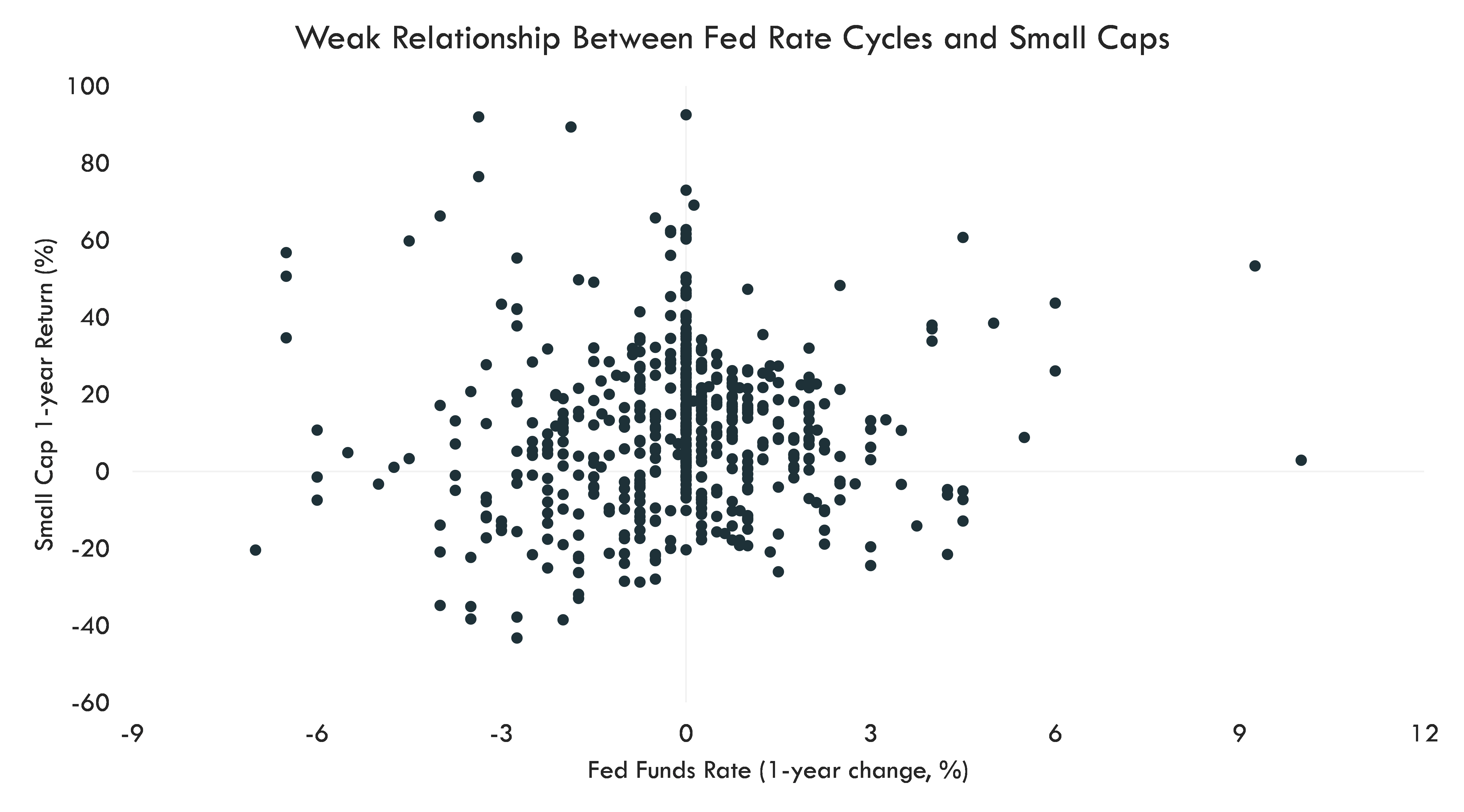 Had there been a strong historical link between the Fed’s rate policy and small-cap performance, we would expect to see a discernable pattern in the data, with returns generally trending from the top left to the bottom right. However, a scatterplot of rolling 1-year periods, showing changes in the Fed Funds rate on the x-axis and small-cap returns on the y-axis, resembles more of a Rorschach test than a clear trend. For example, when the Fed lowered rates by 3%-6%, small-cap returns ranged widely from -38% to 92%, with positive outcomes just under half the time. This lack of correlation suggests that other factors may be more influential drivers of small-cap performance.