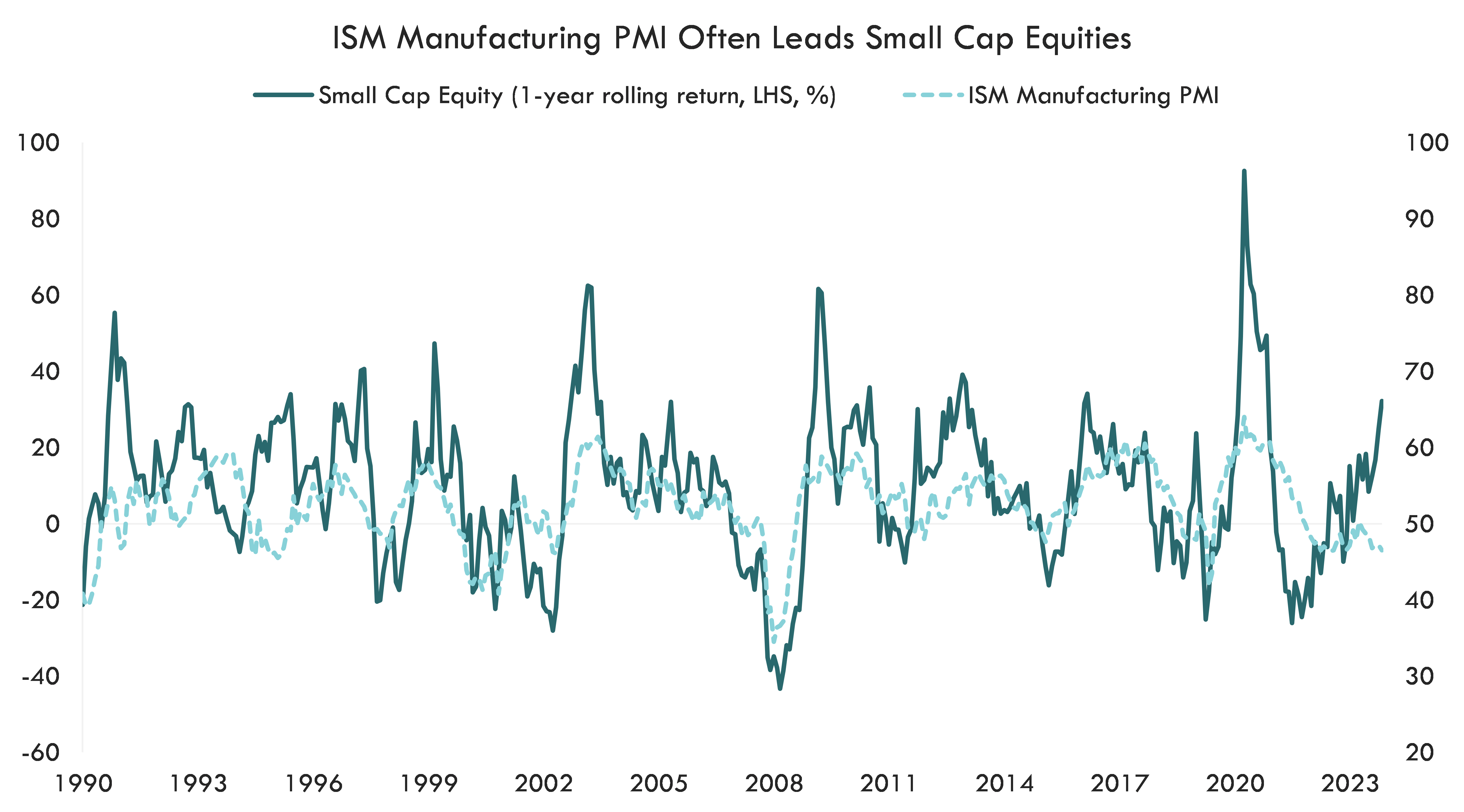 The regime change in 2016 provided a tailwind for small companies, boosting confidence in favorable tax policies and lighter regulation. This sentiment was reflected in a surge in the NFIB Small Business Optimism Index. Recently, small-caps have enjoyed short-term outperformance against large-caps after headline CPI peaked, the Fed paused its tightening cycle in 2023, as markets priced in rate cuts in 2024, and following the latest changes in Washington. However, rate cuts alone are unlikely to drive sustained small-cap outperformance. Alongside continued rate easing, I would monitor small business optimism, economic growth, and earnings trends closely prior to considering a tactical overweight in small-cap equities.
