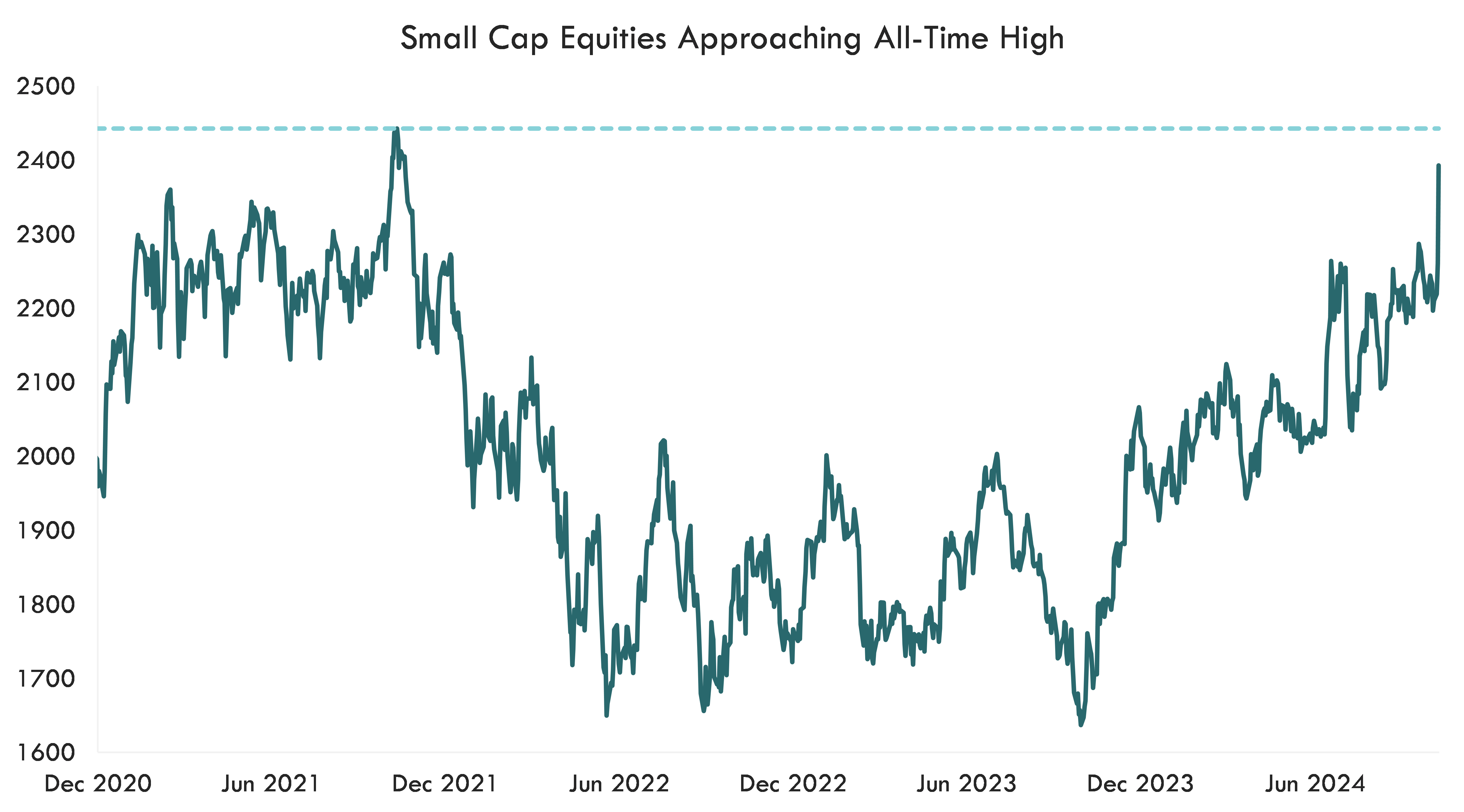 Source: Bloomberg, Innovator Research & Investment Strategy. Small-cap equity prices represented by the Russell 2000 Index. Daily price data from 12/31/2020 - 11/6/2024. Past performance is not indicative of future results. One cannot invest directly into an index.
