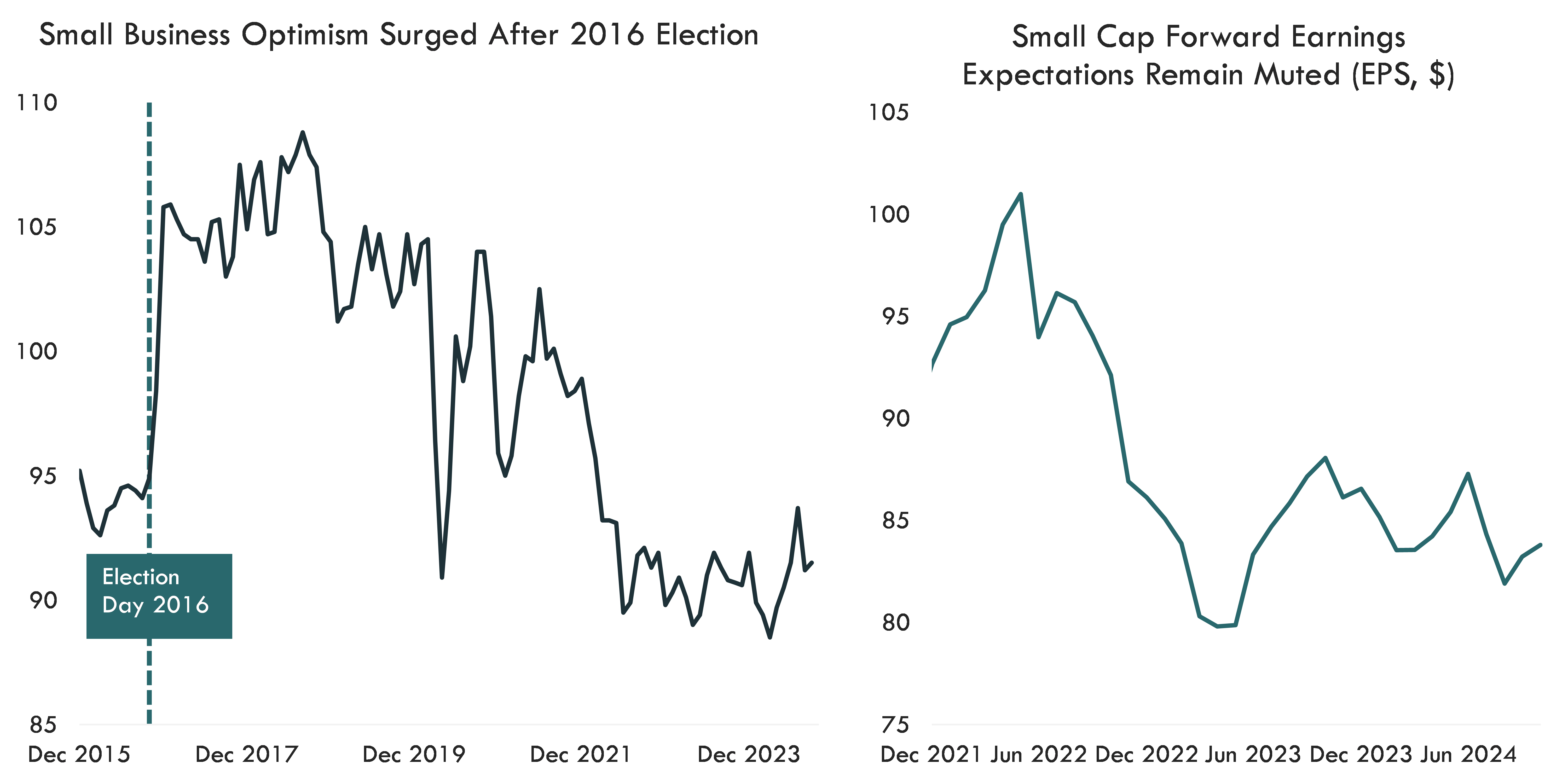 Source: Bloomberg, Innovator Research & Investment Strategy. Small Business Optimism measured by the NFIB Index. Monthly data from 12/31/2015 – 9/30/2024. Forward EPS Expectations shown for the Russell 2000 Index from 12/31/2021 – 10/31/2024.