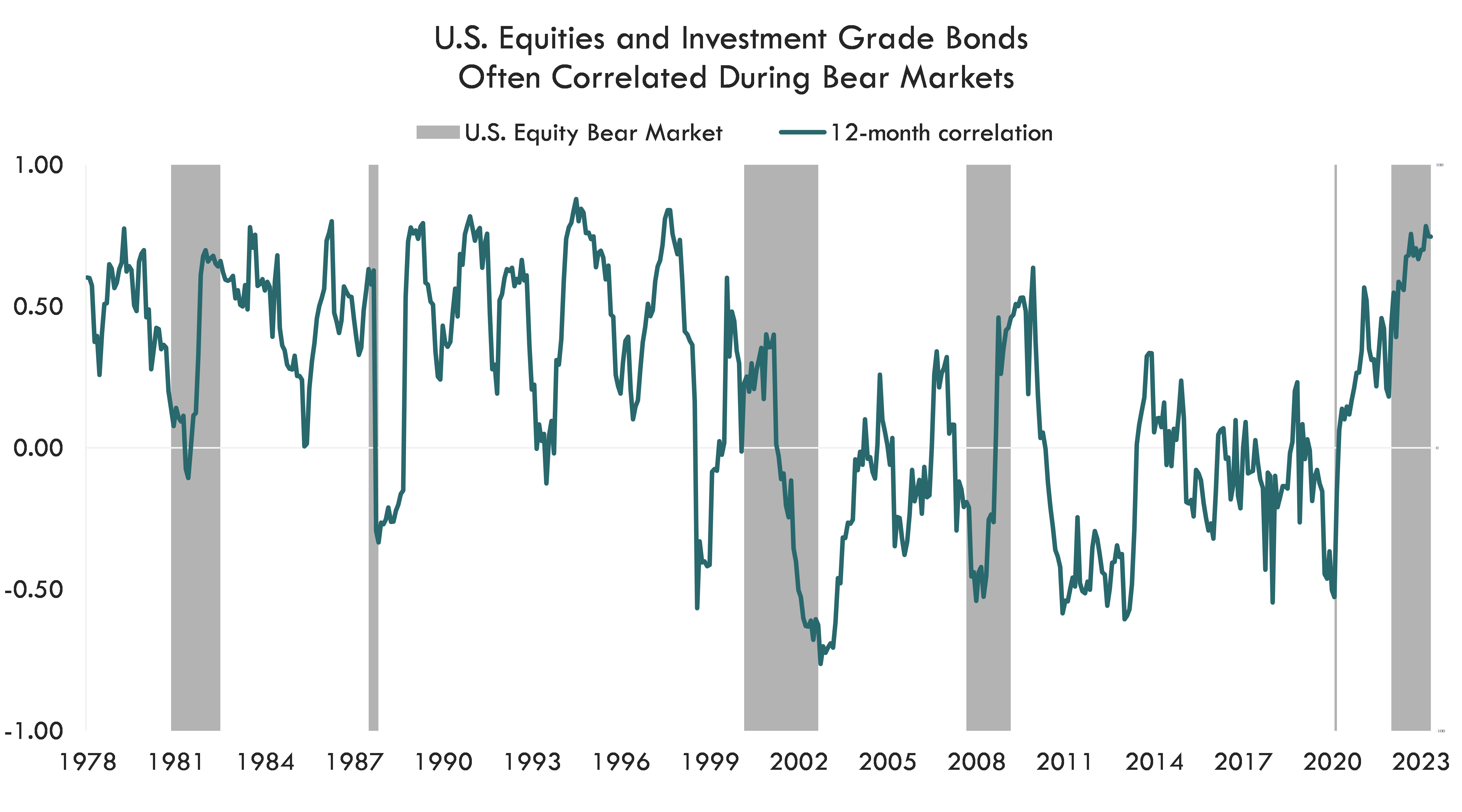 Source: Bloomberg, Innovator Research & Investment Strategy. U.S equities = S&P 500. Investment Grade Bonds = Bloomberg U.S. Aggregate Bond index. Correlation is a statistical measure of the strength of a linear relationship between two asset returns.