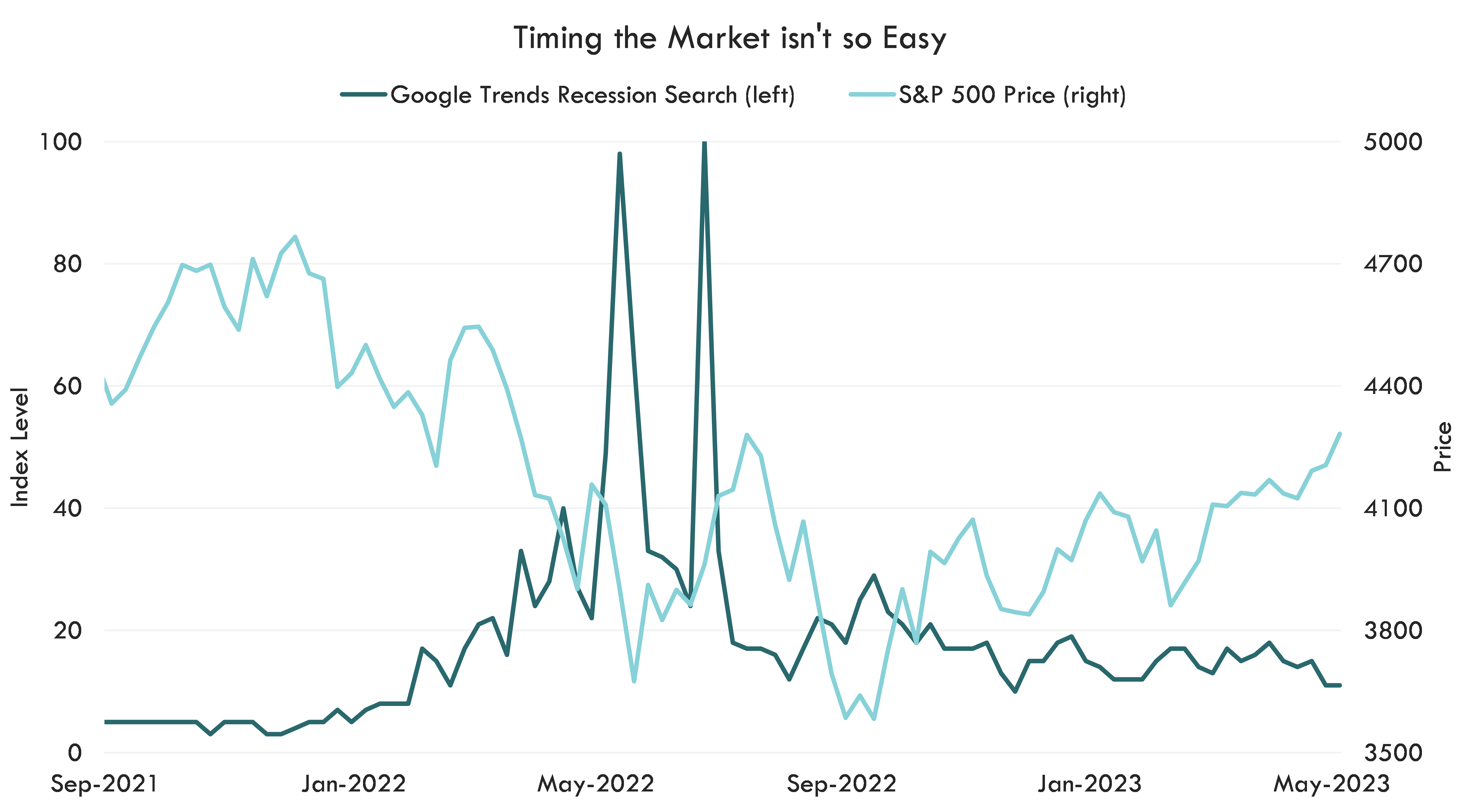 Using 2022 as an example, investor concerns about recession didn’t peak until the week of June 12. By that point in the year, the S&P 500 had already declined 15.5%. Exiting at that peak would’ve caused investors to miss the run up in the summer and possibly the 4th quarter of equity gains.