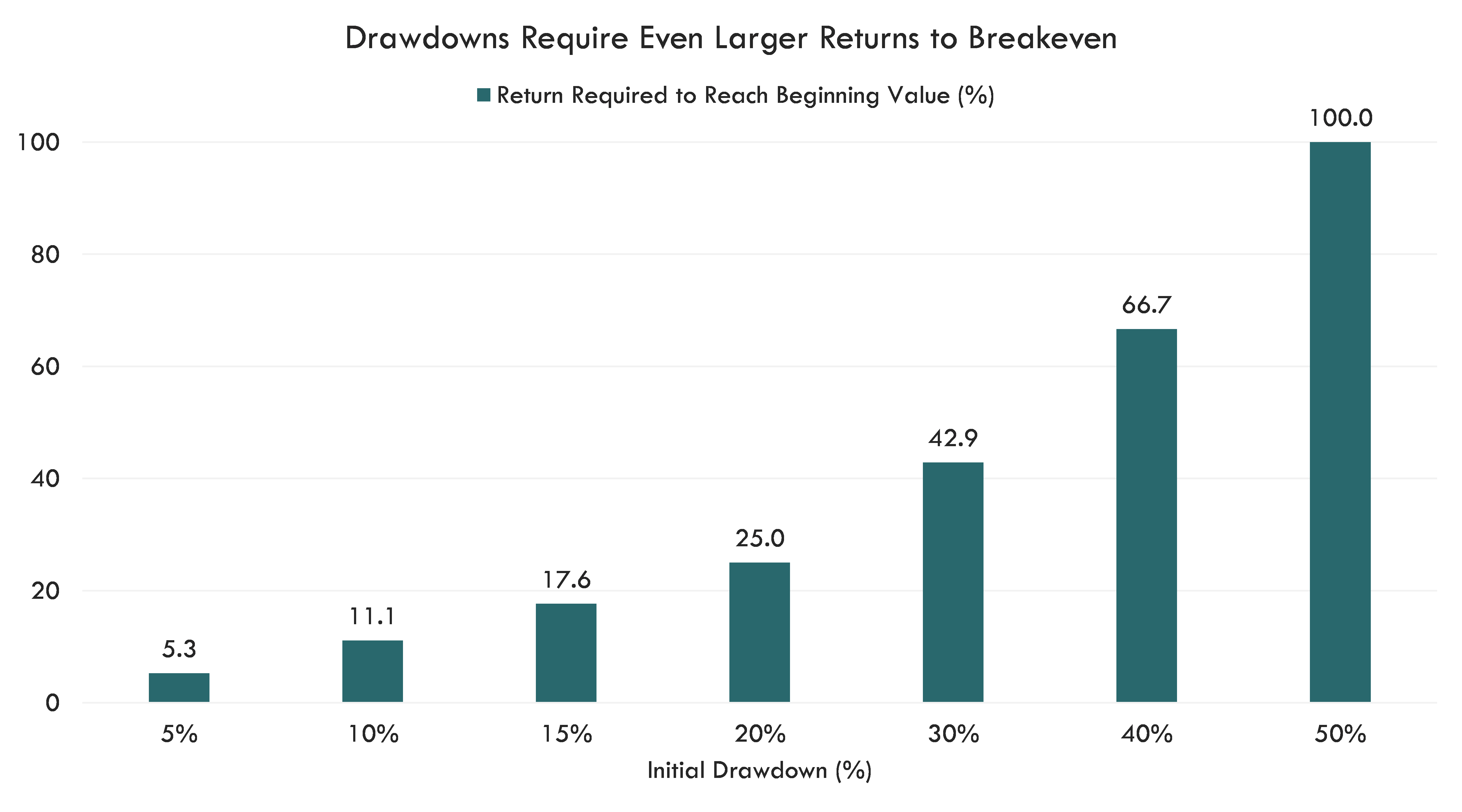 Saving for a home, starting a business, or paying for children’s tuition are all examples of events requiring liquidity. In the event of a market drawdown, investors may have to sell securities at a loss, or at least at a price that is insufficient to meet their investment goal. On average, it has taken almost a year and a half for the U.S. equity market to return to its original levels after a bear market drawdown; the larger the drawdown, the longer the recovery may take because a larger return is required to breakeven.