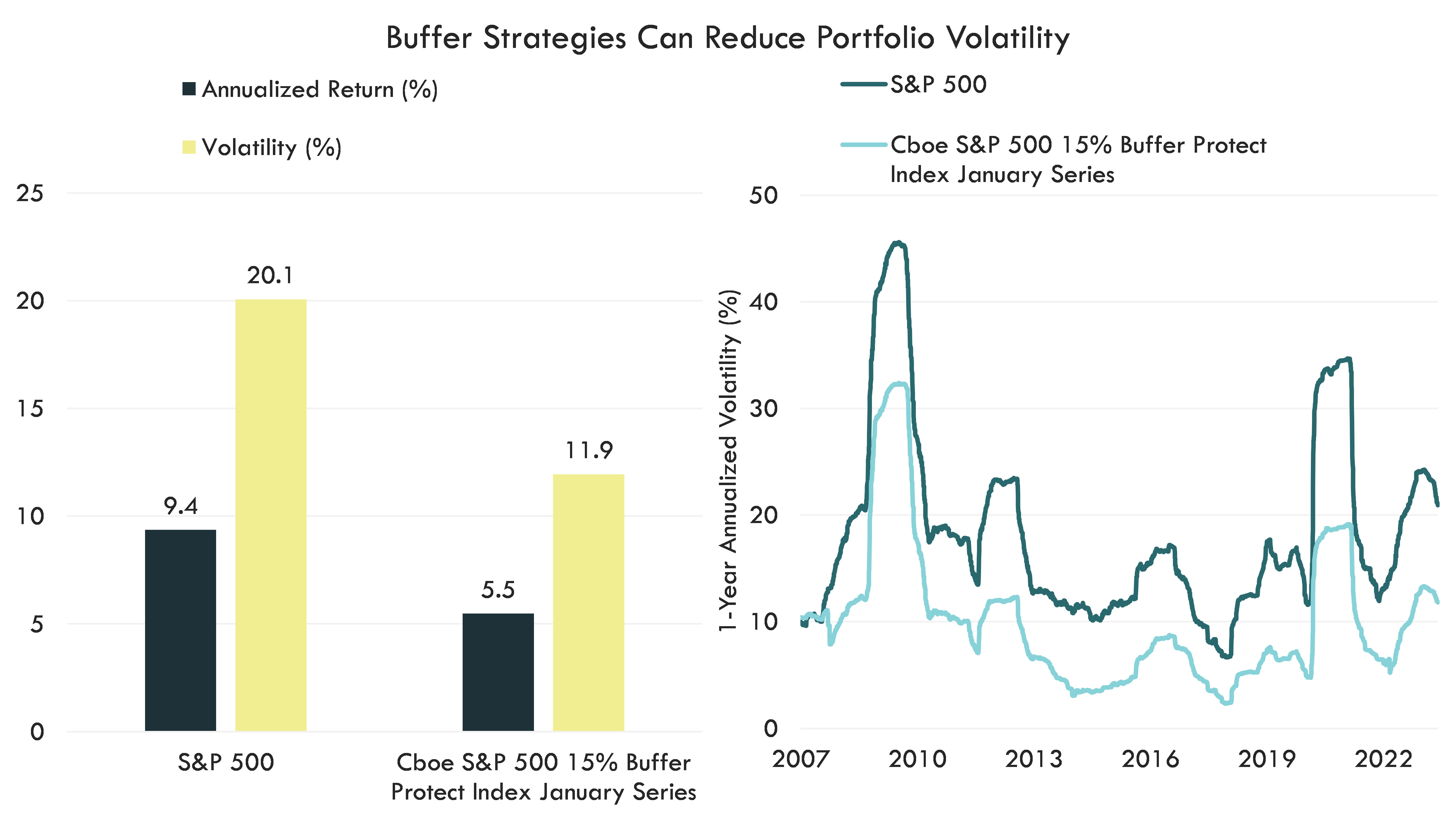 Buffer strategies can help diversify portfolios across a variety of market environments. Regardless of where investors position buffer strategies within the portfolio, the strategies are designed to provide known levels of downside risk mitigation and exposure to the market’s upside potential.