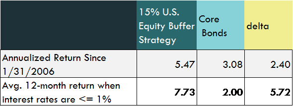 Source: Bloomberg, Innovator Research & Investment Strategy. Interest rates are proxied by the Fed funds rate upper limit. Data from 1/31/2006 -5/31/2023. 15% U.S. Equity buffer strategy = CBOE S&P 500 15% Buffer Protect Index January Series. Core Bonds = Bloomberg U.S. Aggregate Bond Index. Past performance does not guarantee future results.