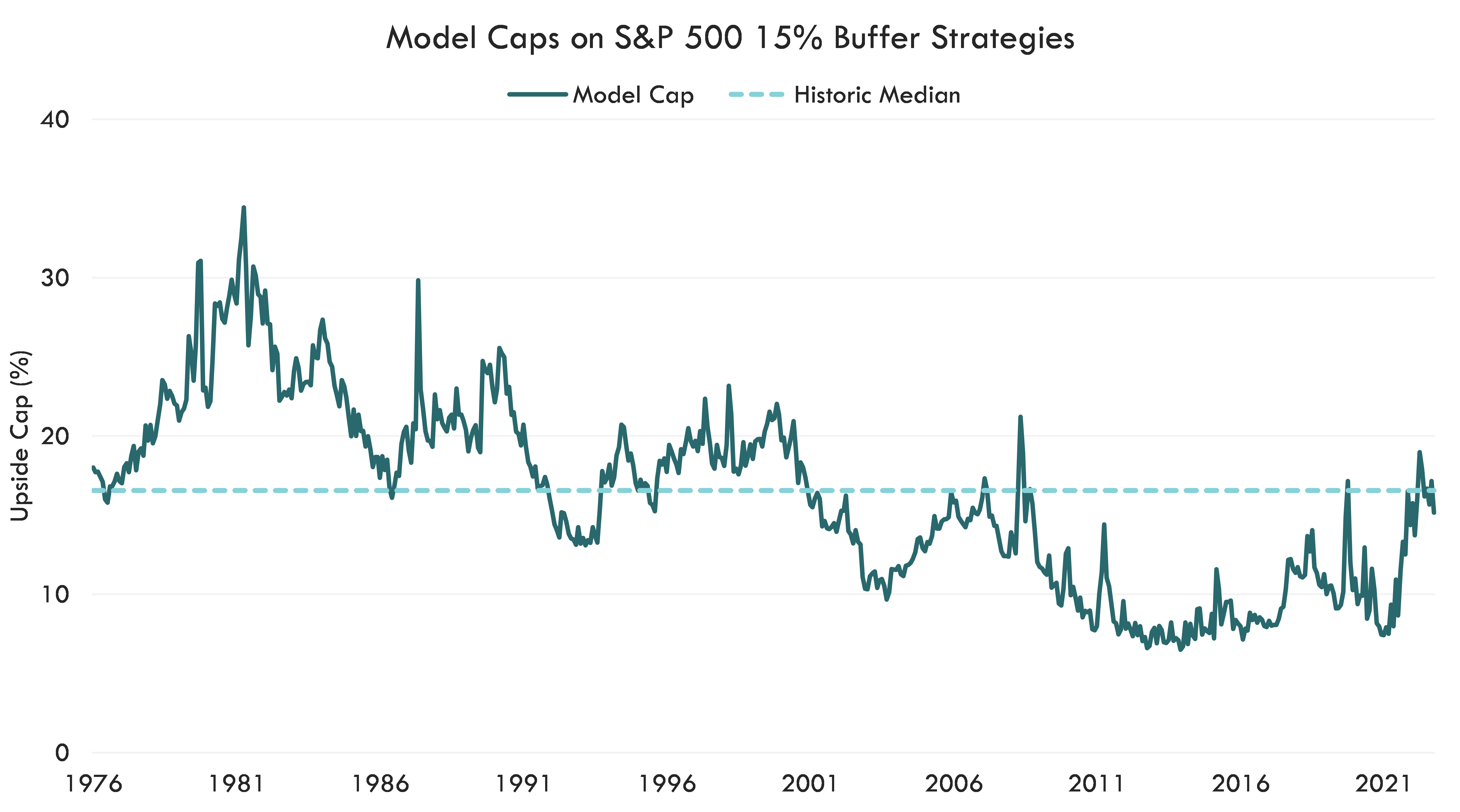 Outcome periods with mid-double-digit caps may lead investors to cut out a portion of both equity and bond sleeves for buffer strategies. We are coming off a decade of low caps as the Federal Reserve’s Zero-Interest-Rate-Policy held caps at below historic medians. With Interest rates at normalized levels, we expect caps to remain at these higher levels in the short to intermediate time horizon.