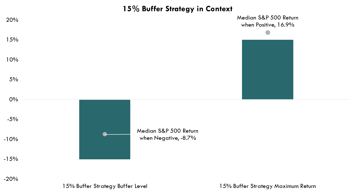 Investors are rethinking the traditional asset allocation. While a buffered equity allocation has never had a negative correlation to the equity market, over the long-term, investors may have an advantage allocating to a 15% buffer strategy. The 15% buffer strategy is designed to allow investors to participate meaningfully in market rallies, to a cap, while having a known downside buffer over each outcome period should the market fall. On a 1-year return basis, dating back to 1950, when positive, the median S&P 500 return is 16.9%. On the flip side, when the market is negative it has a median return of -8.7%. A 15% buffer strategy, assuming a cap of 15% each outcome period, could realize the full 15% return in a typical positive S&P 500 market. In a typical negative S&P 500 environment, the strategy would fully buffer investors from the -8.7% return.