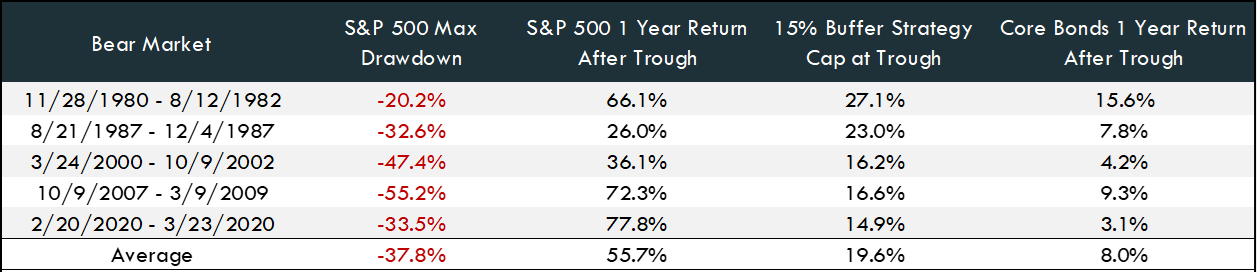 The table below illustrates the power of staying invested in the equity market despite severe drawdowns. Looking at the last five bear markets, the 15% buffer strategy cap at trough averaged around 20%; meaningfully higher than core bond returns. This means when the market rebounded, the 15% buffer strategy would have been capped out in every scenario, doubling or tripling the returns of core bonds in the short, 1-year time frame. This highlights the power of tying low-risk dollars to the equity market, as investors who moved to bonds would have missed out on these rebounds.